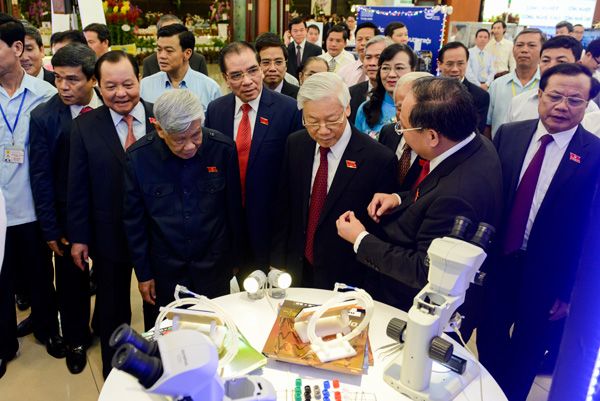 Các đồng chí lãnh đạo Đảng và Nhà nước tham quan khu vực triển lãm về Công nghiệp công nghệ cao và Nông nghiệp công nghệ cao của TPHCM.