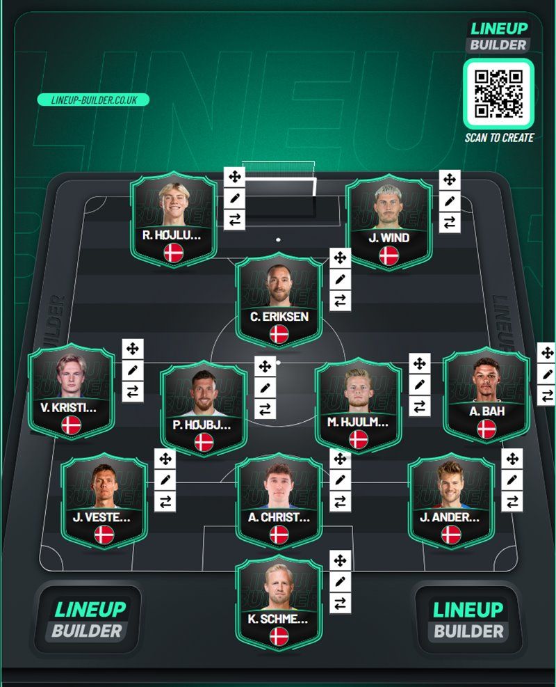 HLV Kasper Hjulmand vẫn sẽ có trong tay đội hình mạnh nhất để đối đầu với tuyển Anh. Cặp đôi MU, Eriksen và Hojlund tiếp tục trở thành niềm hy vọng trên hàng công với mục tiêu giành lấy 3 điểm trước Tam Sư.
