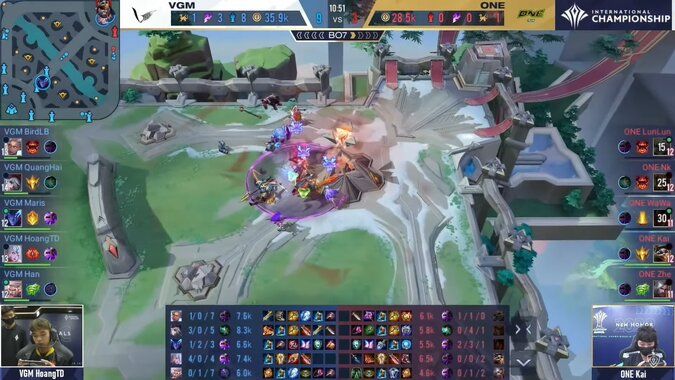 VGM lựa chọn đội hình giao tranh tổng mạnh, trong khi ONE Team chọn đội hình đẩy lẻ khó chịu với Ryoma ở đường top và Keera ở đường rừng. Vì có phần thua thiệt về chất tướng mà giai đoạn đầu game, đội tuyển Việt Nam đã phải đánh trong thế thủ trụ, tuy nhiên sau đó họ đã tràn lên bằng đội hình giao tranh mạnh. Sau mỗi giao tranh thì ít nhất có 1 người bên ONE Team phải nằm lại.