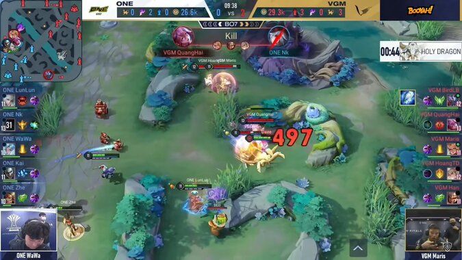 Sử dụng đội hình giao tranh mạnh, ONE Team liên tục di chuyển để gây áp lực cho đường rồng của HoàngTD và Han. Hiểu được ý đồ đó, VGM tập trung lấy trụ và hạn chế giao tranh. Tuy ONE Team luôn tập hợp sớm và chiến thắng trong nhiều lần giao tranh tổng, nhưng những mạng bị hạ gục của Han và Maris không làm ảnh hưởng đến trận đấu.