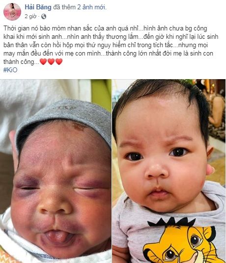 Mới đây Hải Băng chia sẻ lại bức ảnh mới sinh chưa từng được công khai của KiO. Hình ảnh cậu bé tím tái khiến nhiều người không khỏi xót xa. Hải Băng xúc động chia sẻ: "Thời gian nó bào mòn nhan sắc của anh quá nhỉ. Hình ảnh chưa bao giờ công khai khi mới sinh anh. Nhìn anh thấy thương lắm. Đến giờ khi nghĩ lại lúc sinh, bản thân vẫn còn hồi hộp. Mọi thứ nguy hiểm chỉ trong tích tắc nhưng mọi may mắn đều đến với mẹ con mình. Thành công lớn nhất đời mẹ là sinh con thành công!".