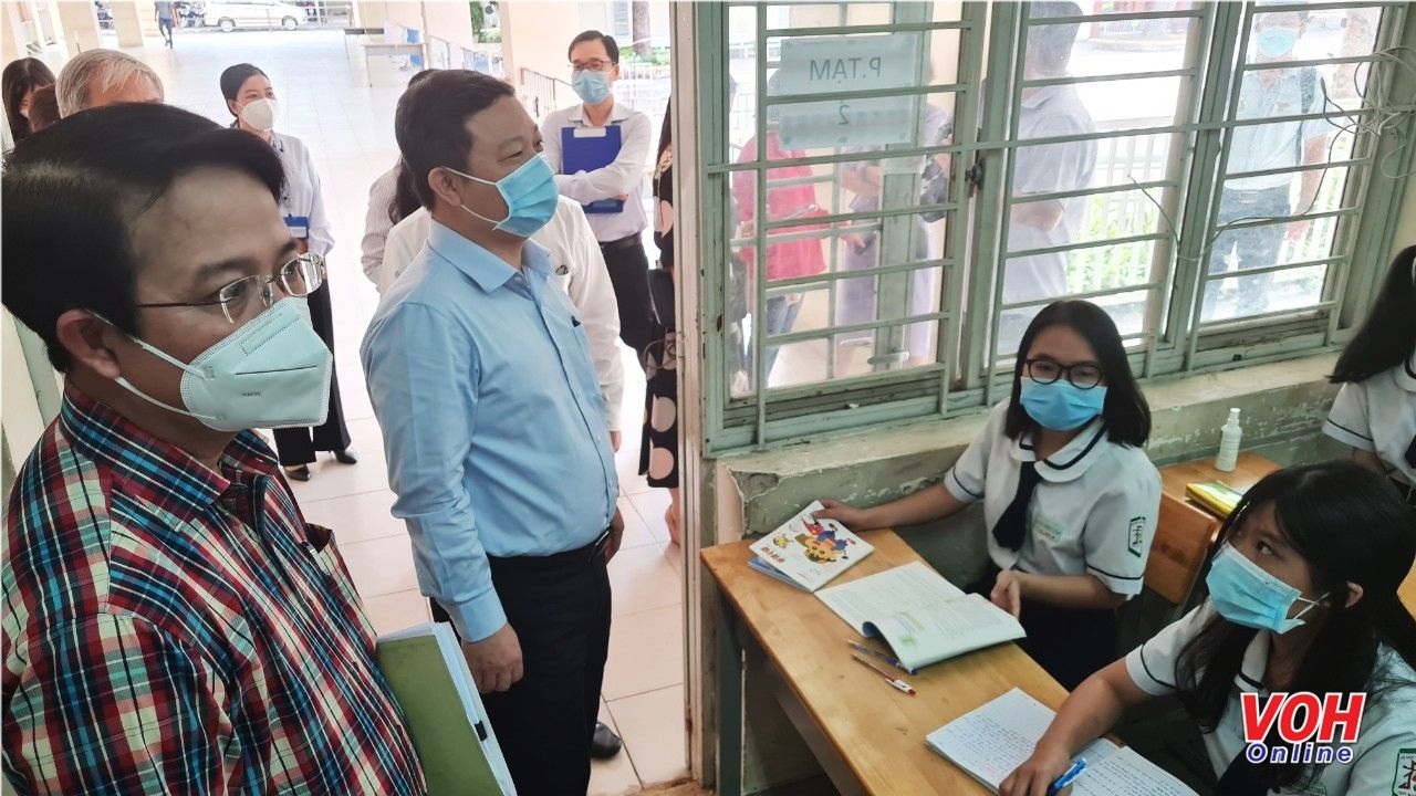 Đoàn làm việc do ông Dương Anh Đức, Phó chủ tịch UBND Thành phố dẫn đầu đi thực tế kiểm tra công tác dạy học trực tiếp của học sinh lớp 12 trường Trung học phổ thông Mạc Đĩnh Chi, Quận 6.