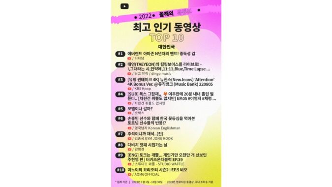 Mới đây, mạng xã hội Youtube vừa công bố danh sách những video được người Hàn Quốc xem nhiều nhất năm 2022. Cụ thể, YouTube đã chia sẻ danh sách 10 video âm nhạc được phát hành trong năm nay thu hút được nhiều lượt xem nhất tại Hàn Quốc. Danh sách này chỉ bao gồm các video âm nhạc được tải lên YouTube vào năm 2022, dữ liệu được thu thập từ ngày 1/1 đến ngày 30/10.