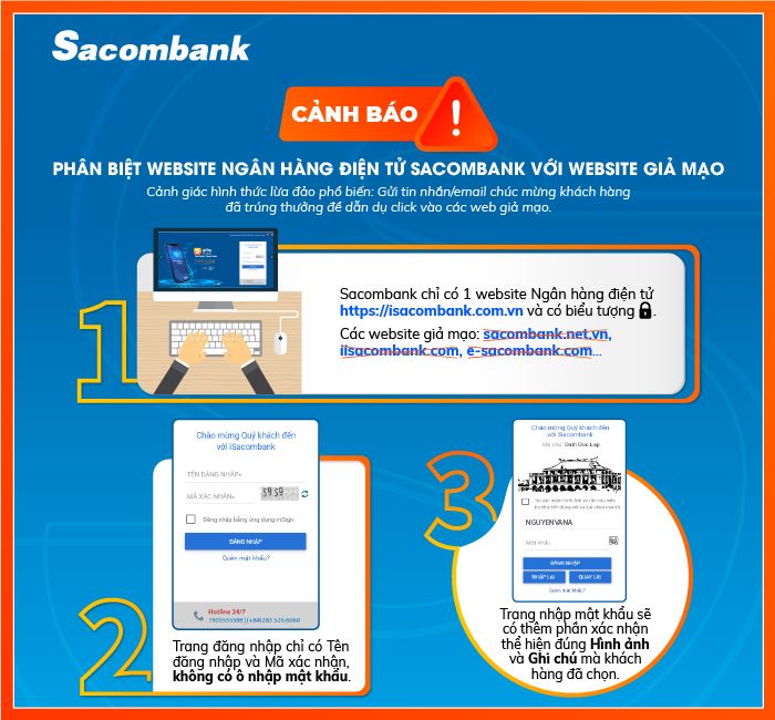 Sacombank khuyến cáo các khách hàng tuyệt đối không bấm vào bất cứ đường link nào khác website ngân hàng điện tử chính thức isacombank.com.vn của Sacombank và không cung cấp các thông tin bảo mật như mật khẩu, OTP, mã PIN thẻ… cho bất cứ ai, kể cả nhân viên ngân hàng.