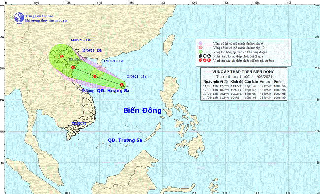 Dự báo trong 24 giờ tới, vùng áp thấp di chuyển theo hướng Tây Tây Bắc, mỗi giờ đi được khoảng 15km và có khả năng mạnh lên thành áp thấp nhiệt đới. Đến 13 giờ ngày 12/6, vị trí tâm áp thấp nhiệt đới ở khoảng 18,7 độ Vĩ Bắc; 109,3 độ Kinh Đông, ngay trên khu vực phía Nam đảo Hải Nam (Trung Quốc). Sức gió mạnh nhất vùng gần tâm áp thấp nhiệt đới mạnh cấp 6-7 (40-60km/giờ), giật cấp 9.