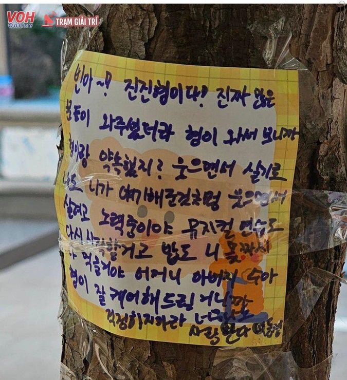 “Bin à! Anh JinJin đây! Có vẻ như đã có rất nhiều người đến thăm em đó. Em đã hứa với anh là luôn tươi cười, luôn sống vui vẻ mà phải không? Như lời em nói, anh cũng đang làm việc chăm chỉ để sống vui vẻ cười tươi như em đã từng.