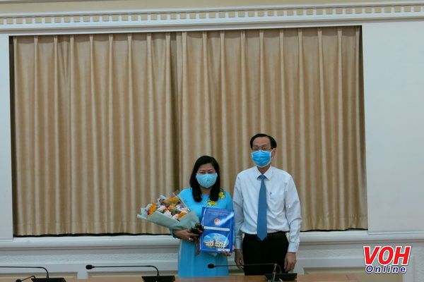 Phó Chủ tịch Thường trực UBND TPHCM Lê Thanh Liêm trao quyết định và hoa chúc mừng cho bà Nguyễn Thị Hồng Thắm